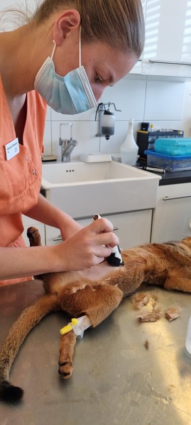 Chirurgische Vorbereitung der Kätzin vor der Kastration (in Vollnarkose).