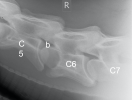 Die Facettengelenke (a) sind schön glatt ausgebildet. Die Austrittslöcher (b) sind weit offen und geben Platz für die Halsnerven.