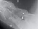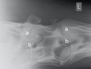 Die Facettengelenke (a) sind massiv vergrössert und nach oben und unten unregelmässig zugebildet. Die Austrittslöcher (b) sind stark eingeengt.